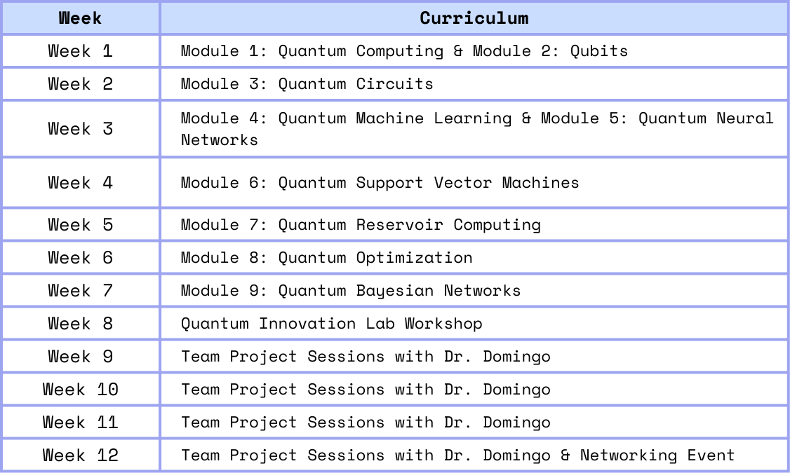Schedule: See below for the weekly schedule. Official meetings times set based on cohort availability to ensure maximum engagement.